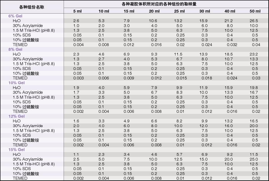 SDS-PAGE分離膠配方表