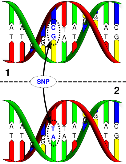 單核苷酸多態(tài)性(Single Nucleotide Polymorphisms,SNPs),指由于單個(gè)核苷酸堿基的改變而導(dǎo)致的核酸序列的多態(tài)性。在不同個(gè)體的同一條染色體或同一位點(diǎn)的核苷酸序列中,絕大多數(shù)核苷酸序列一致而只有一個(gè)堿基不同的現(xiàn)象,這就是SNP。
