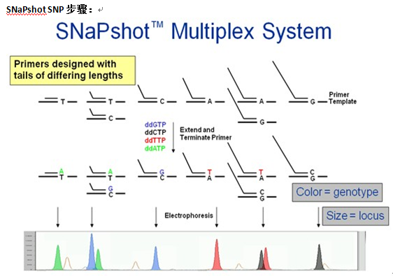 在一個(gè)含有測序酶,四種熒光標(biāo)記的ddNTP,緊挨多態(tài)位點(diǎn)5’端的不同長度延伸引物和PCR產(chǎn)物模板的反應(yīng)體系中,引物延伸一個(gè)堿基即終止,經(jīng)ABI測序儀跑膠后,根據(jù)峰的顏色可知摻入的堿基種類,從而確定該樣本的基因型,根據(jù)峰移動(dòng)的膠位置確定該延伸產(chǎn)物對(duì)應(yīng)的SNP位點(diǎn)。對(duì)于PCR產(chǎn)物模板可通過多重PCR反應(yīng)體系來獲得,通常用于6-30個(gè)SNP位點(diǎn)分析。