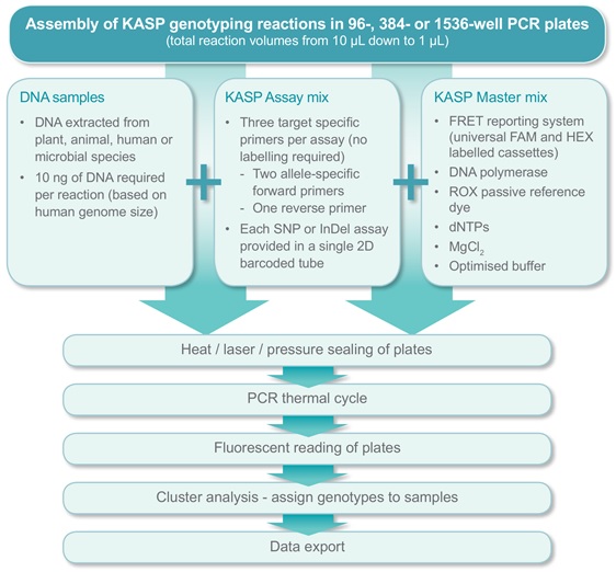 由于KASP實驗方案的高度靈活性,其應用也十分廣泛,適合于各種基因分型研究,無論是中低通量SNP研發(fā)項目,NGS之后的SNP驗證,農(nóng)業(yè)種群研究,或者大量種子的生產(chǎn)QC和生物樣品庫 DNA Biobanking等都是其適用的范圍。