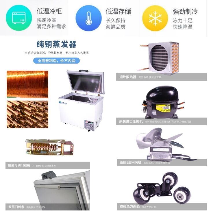 保溫層100mm,不銹鋼內(nèi)膽,品牌壓縮機(jī),進(jìn)口控制器,環(huán)?;旌现评涔べ|(zhì) |