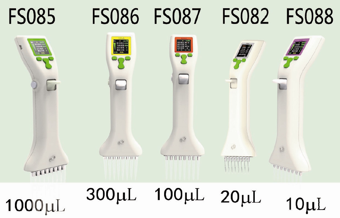 | FS086 | 8通道電動移液器 | 30~300 | 10~360 | 1 | 300、500μL |