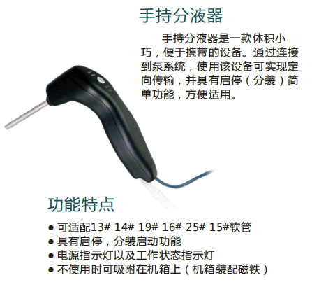 3. 按下手持器上的按鈕,啟動(dòng)蠕動(dòng)泵分裝或傳輸液體,此時(shí)手持器上藍(lán)色指示燈亮;當(dāng)蠕動(dòng)泵停止時(shí),藍(lán)色指示燈滅。