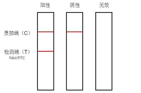 試紙條質控線(C線)出現(xiàn)一條紅色條帶,檢測線(T線)沒有條帶。陰性結果表明樣本中不含目的核酸片段,或其數(shù)量低于試紙條的最低檢出量。