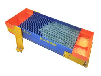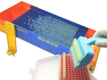 將吸頭倒入操作臺(tái)面上端,左右搖晃移液器裝盒器使吸頭通過斜置滑道進(jìn)使吸頭進(jìn)入各條卡槽內(nèi),再清沒有進(jìn)入槽入的吸頭;將后接料槽切換為接料模式,用12齒吸頭取出器從下接料托從下向上取出吸頭裝入吸頭盒,重復(fù)進(jìn)8次裝滿一盒;10ul白吸頭一次約可以裝4-8盒之間,黃吸頭約可以裝4-5盒之間(裝盒數(shù)量多少主要因素滑道里吸頭數(shù)量,重復(fù)添料次數(shù)。)